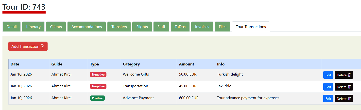 A tour transaction is a ledger entry used to track specific financial movements, such as expenses or payments, associated with a particular tour ID. These entries are categorized as either "Negative" for outgoing costs like transportation or gifts, or "Positive" for incoming funds like advance payments for expenses. Each record includes the date, the responsible staff member, the currency amount, and a brief description to maintain a clear audit trail.