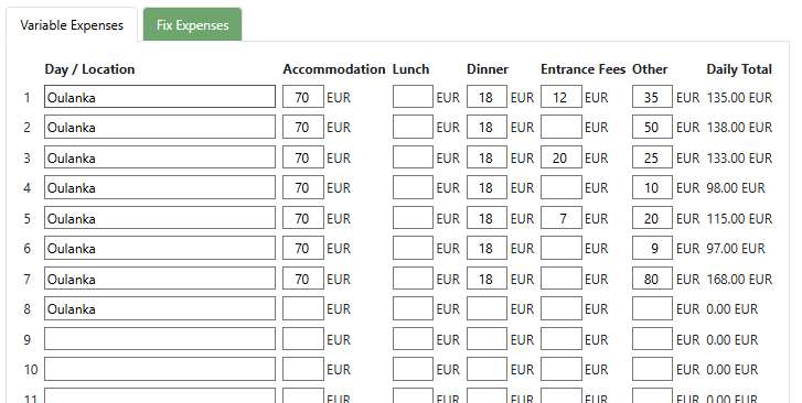 | Lunch / Dinner | Meal costs. Leave empty if not included |
