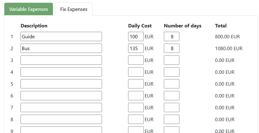 Fix expenses are per tour. e.g. cost of the Guide per trip.