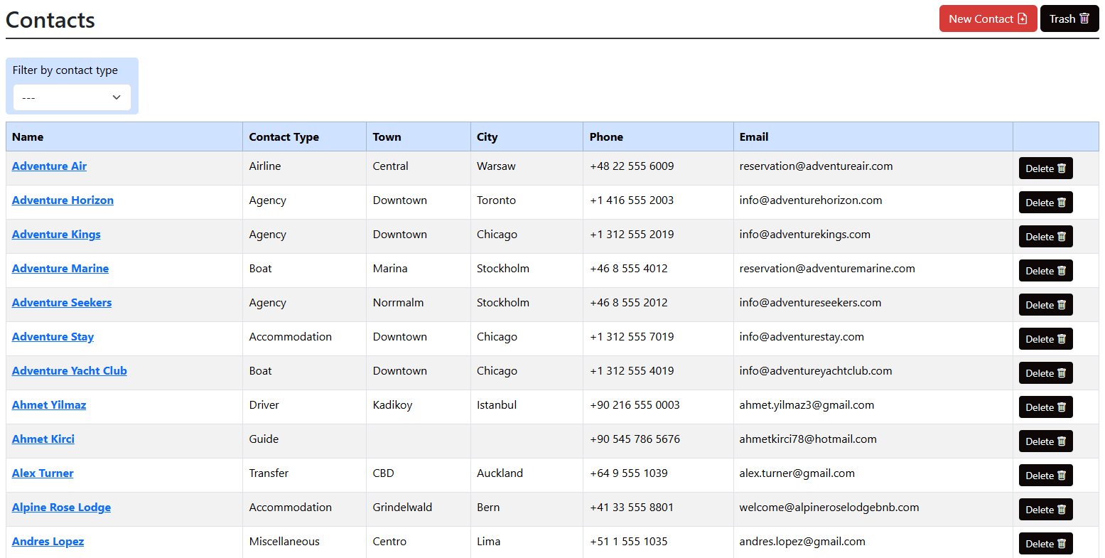 The Contacts allows you to store, organize, filter, and manage all people and companies related to your tours in one centralized place. Contacts can include agencies, guides, drivers, accommodations, airlines, transfers, and more.