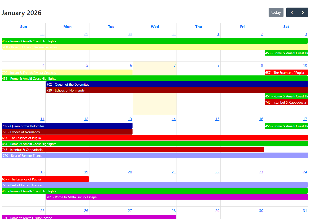 Calendar view of the tours. Color coding comes from tour detail page settings.