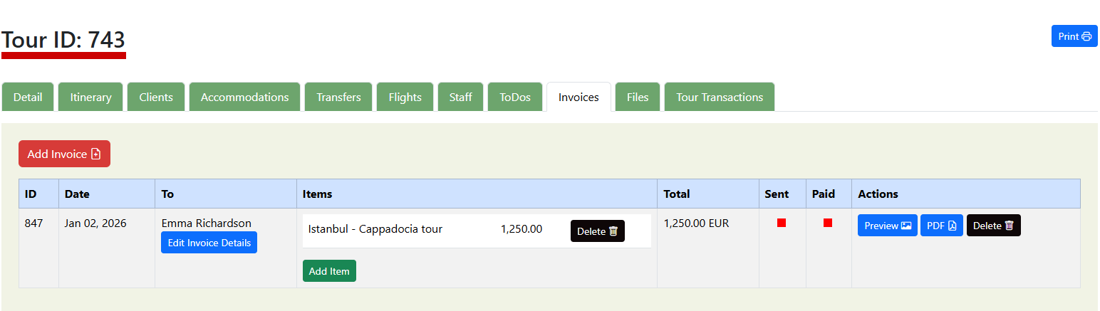 The Invoices section allows you to create, manage, send, and track invoices related to a specific tour. Each invoice is directly linked to the tour, ensuring accurate financial tracking and transparency.